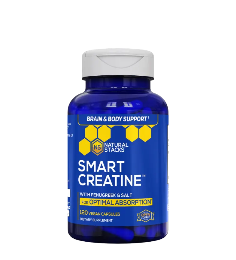 Natural Stacks Smart Creatine (ehemals Creatine+) kombiniert Kreatinmonohydrat mit Bockshornkleesamenextrakt und Himalayasalz zur Unterstützung der Absorption. Für den Muskel-, Blutzucker- und Fettstoffwechsel. 120 Kapseln für 30 Tage.