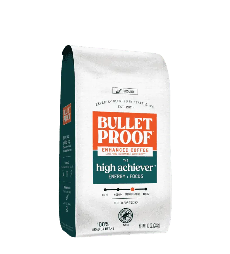 Bulletproof Coffee The High Achiever Ground ist ein gemahlener Arabica-Kaffee, angereichert mit B-Vitaminen, Löwenmähne und CoffeeBerry®. Mittel-dunkle Röstung. Gemahlen für French Press, Filter oder Pour-over. Auf Mykotoxine getestet. 284 g für 22 Portionen.
