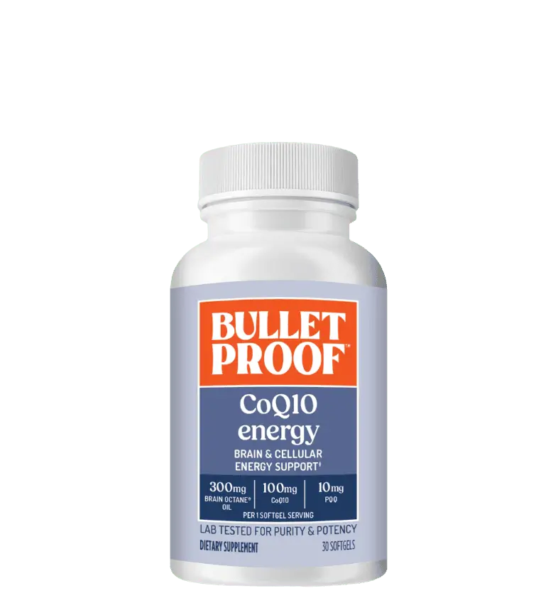 Da CoQ10 fettlöslich ist, sollte es am besten mit einer fetthaltigen Mahlzeit eingenommen werden. Bulletproof CoQ10 Energy enthält 100 mg Coenzym Q10 und 10 mg PQQ pro Softgel.