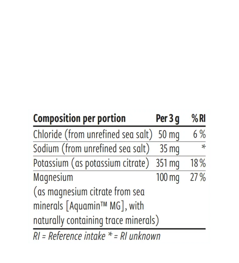 Kaliumcitrat, Magnesiumcitrat aus Meeresmineralien (Aquamin™ Mg), Glycin, natürliches Aroma, unraffiniertes Meersalz, Säureregulatoren: Zitronensäure, Apfelsäure, Süßungsmittel: Steviolglycoside aus Stevia.