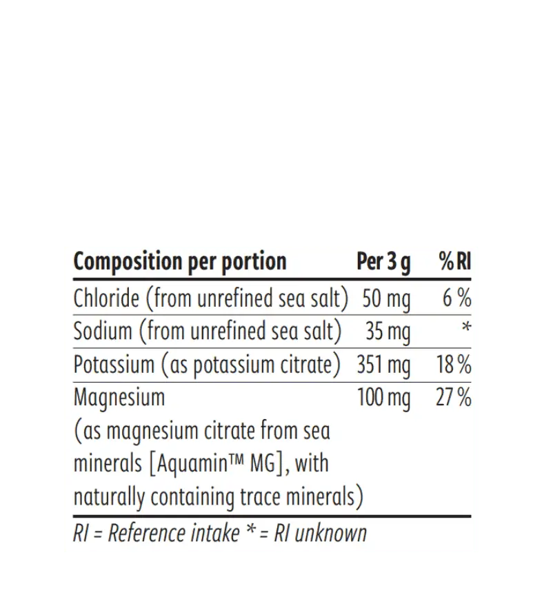 Kaliumcitrat, Magnesiumcitrat aus Meeresmineralien (Aquamin™ Mg), Glycin, natürliche Aromen, unraffiniertes Meersalz, Säureregulatoren: Zitronensäure, Apfelsäure, Süßungsmittel: Steviolglycoside aus Stevia.