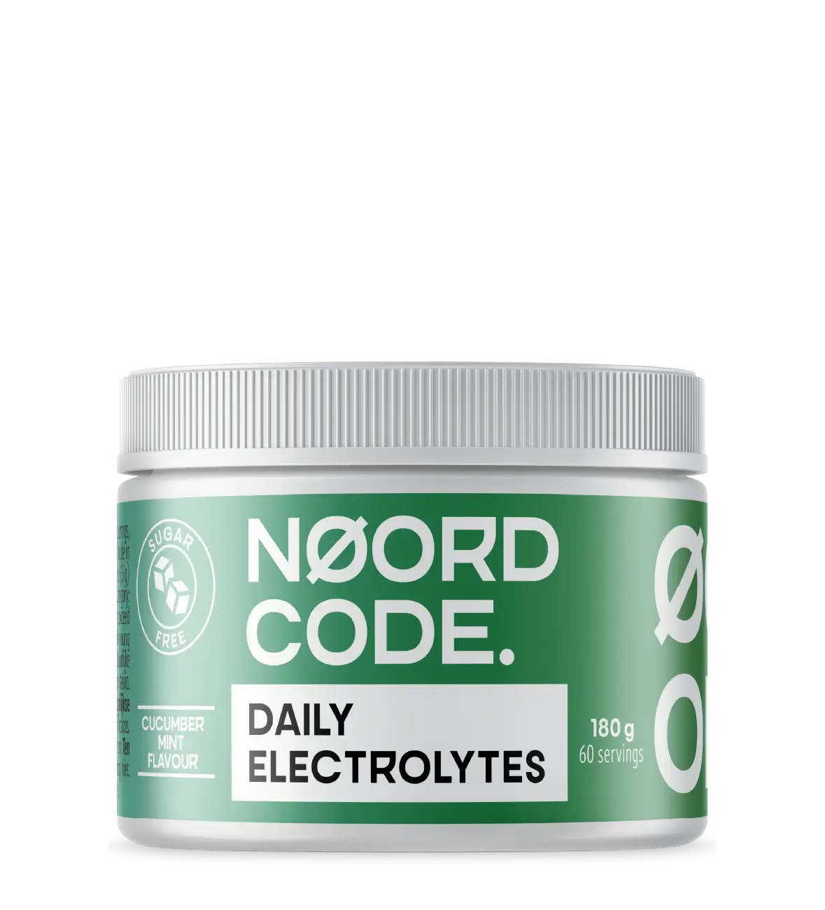 NoordCode Daily Electrolytes Cucumber Mint ist ein zuckerfreies Elektrolyt-Pulver für den täglichen Gebrauch. 350 mg Kalium, 100 mg Magnesium und 35 mg Natrium pro Portion in bioverfügbarer Form. Dezenter Gurken-Minze-Geschmack. 180-g-Dose für 60 Portionen.