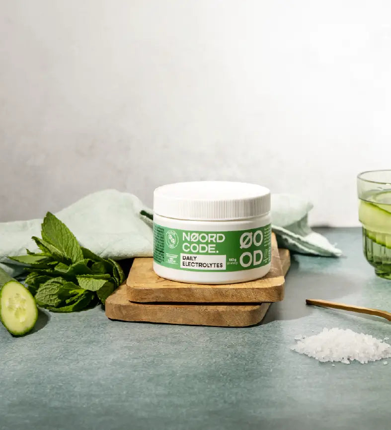 NoordCode Daily Electrolytes ist für jeden geeignet. Das Pulver enthält hauptsächlich Kalium und Magnesium – Mineralien, die schwieriger über die Ernährung aufzunehmen sind als Natrium (aus Salz). Das Kalium-Natrium-Verhältnis von 10:1 orientiert sich an natürlichen Quellen wie Kokoswasser.
