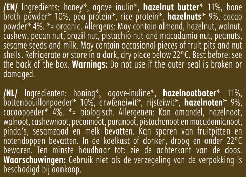 Honig*, Agaveninulin*, Haselnussmus* 11%, Knochenbrühepulver* 10%, Erbsenprotein*, Reisprotein*, Haselnüsse* 9%, Kakaopulver* 4%.