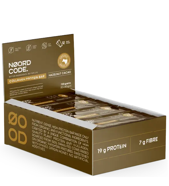 NoordCode Organic Collagen Protein Bar Hazelnut Cacao ist ein geschmackvoller Proteinriegel aus unverarbeiteten Zutaten. Sättigender Snack aus den besten verfügbaren, biologischen Zutaten. 60 g Riegel, einzeln oder in einer 12er-Packung.