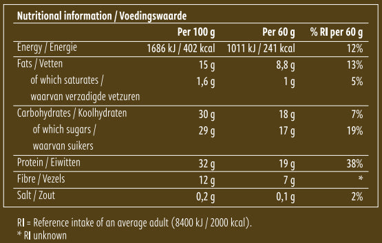 | Nährwertangaben pro Portion | 100 g (% RI) | 60 g (% RI) |