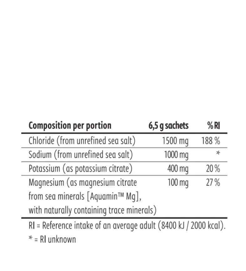 Unraffiniertes Meersalz, Kaliumcitrat, Magnesiumcitrat aus Meeresmineralien (Aquamin™ Mg Soluble), Säureregulator: Zitronensäure, Säureregulator: Apfelsäure, natürliches Aroma, Süßungsmittel: Steviolglycoside aus Stevia.