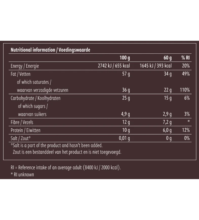 - Kann Milch, Soja, Mandeln, Haselnüsse, Walnüsse, Cashewkerne, Pekannüsse, Paranüsse, Pistazien und Macadamianüsse enthalten.